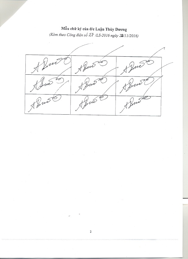 Theo đó, đồng chí Luân Thùy Dương bắt đầu ký các giấy tờ nêu trên kể từ ngày 28/11/2016 thay đồng chí Phạm Thanh Dũng (người đã được giới thiệu tại Công văn số 1442/CV-LS-LSNN ngày 26/4/2013 của Cục lãnh sự, Bộ Ngoại giao).