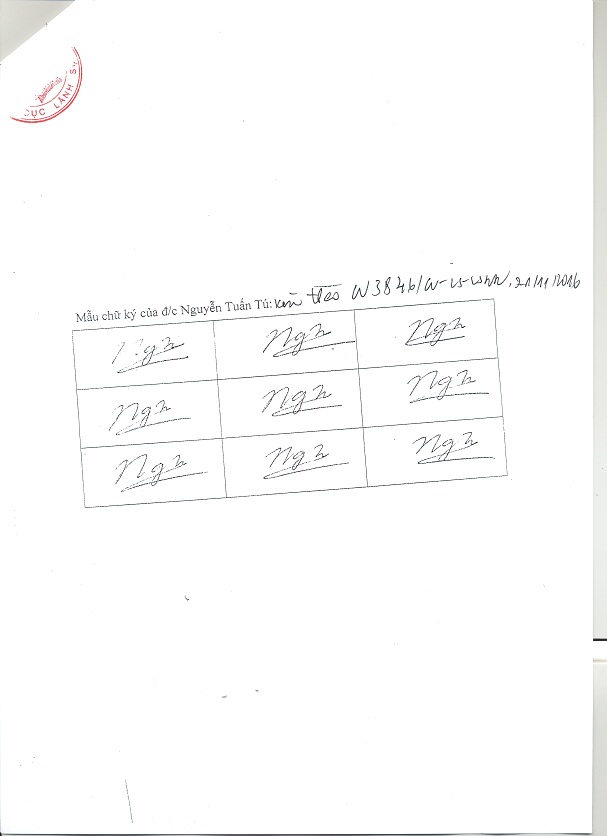 Để bảo đảm kịp thời, thống nhất và hiệu quả trong phối hợp công tác, Cục Hộ tịch, quốc tịch chứng thực thông báo 09 mẫu chữ ký của đồng chí Nguyễn Tuấn Tú để các cơ quan, đơn vị biết.