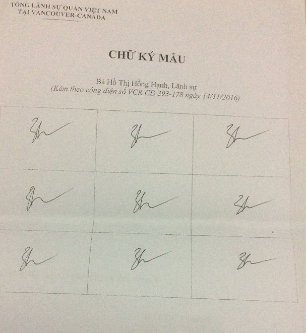 Thực hiện Quyết định số 05/2002/QĐ-BNG ngày 30/7/2002 của Bộ trưởng Bộ Ngoại giao quy định về việc tổ chức giải quyết công tác lãnh sự, căn cứ đề nghị của Tổng lãnh sự quán Việt Nam tại Vancouver, Bộ Ngoại giao đồng ý chấp thuận: đồng chí Hồ Thị Hồng Hạnh, Lãnh sự, thay đồng chí Nguyễn Mạnh Hưng (đã kết thúc nhiệm kỳ công tác và về nước), được ủy quyền ký tất cả các giấy tờ lãnh sự, trừ hộ chiếu ngoại giao và các giấy tờ mà pháp luật về hộ tịch, quốc tịch quy định do người đứng đầu Cơ quan đại diện ký từ ngày 01/12/2016.