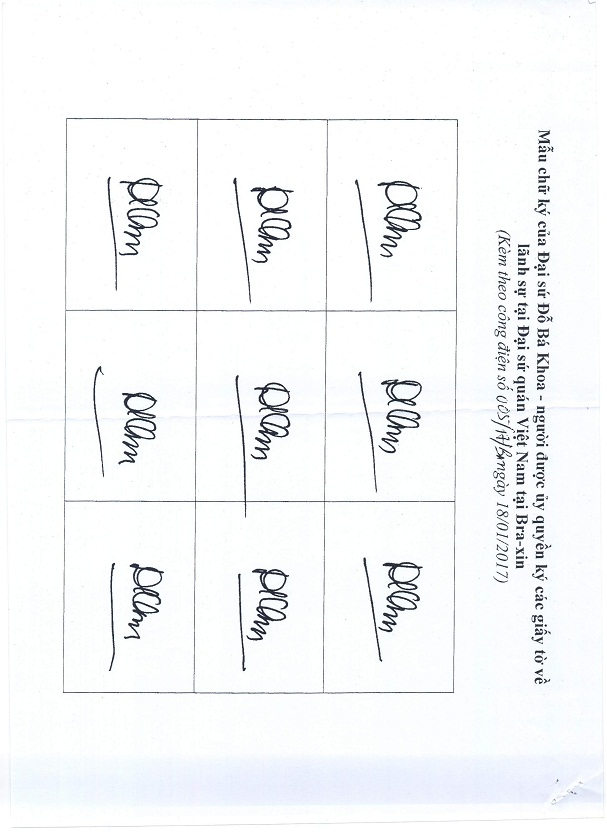 goại giao quy định về việc tổ chức giải quyết công tác lãnh sự, căn cứ đề nghị của Đại sứ Việt Nam tại Braxin, Bộ Ngoại giao đồng ý chấp thuận: đồng chí Đỗ Bá Khoa - Đại sứ Việt Nam tại Braxin được quyền ký các giấy tờ về lãnh sự của Đại sứ quán.