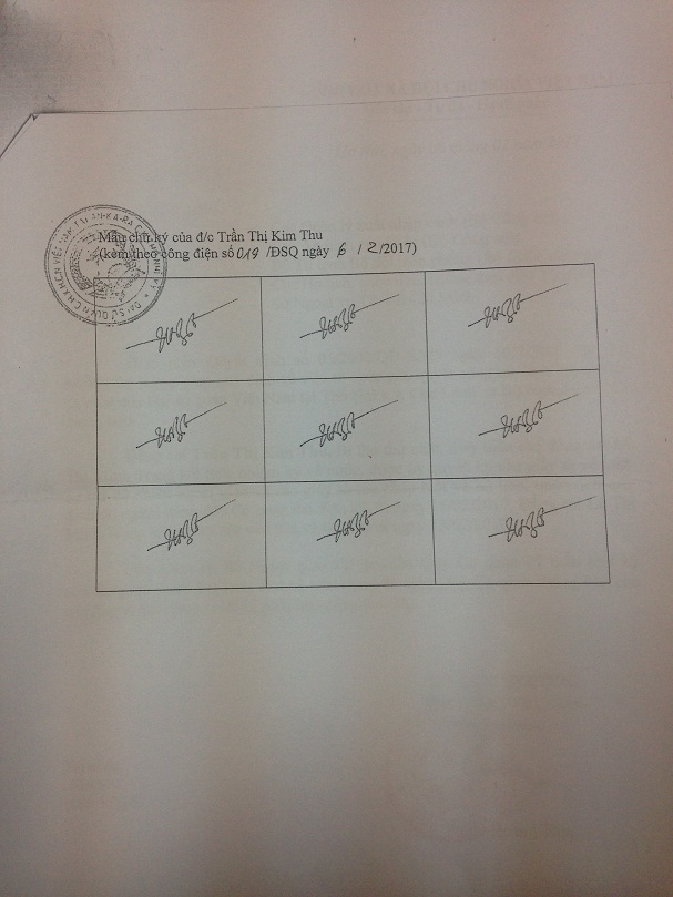 Để bảo đảm kịp thời, thống nhất và hiệu quả trong phối hợp công tác, Cục Hộ tịch, quốc tịch chứng thực thông báo 09 mẫu chữ ký của đồng chí Trần Thị Kim Thu để các cơ quan, đơn vị biết.