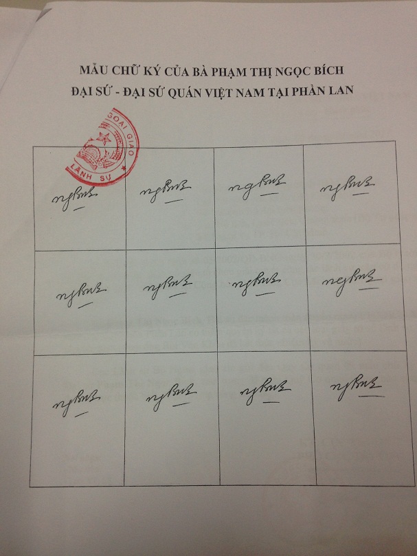 Thực hiện Quyết định số 05/2002/QĐ-BNG ngày 30/7/2002 của Bộ trưởng Bộ Ngoại giao quy định về việc tổ chức giải quyết công tác lãnh sự, căn cứ đề nghị của Đại sứ quán Việt Nam tại Cộng hòa Phần Lan, Bộ Ngoại giao đồng ý chấp thuận: bà Phạm Thị Ngọc Bích - Đại sứ đặc mệnh toàn quyền nước Cộng hòa xã hội chủ nghĩa Việt Nam tại Cộng hòa Phần Lan có thẩm quyền ký tất cả các loại giấy tờ về lãnh sự của Đại sứ quán (thay ông Bùi Văn Khoa đã kết thúc nhiệm kỳ về nước).