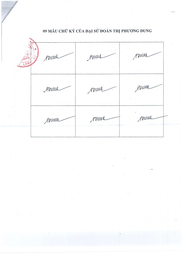 Để bảo đảm kịp thời, thống nhất và hiệu quả trong phối hợp công tác, Cục Hộ tịch, quốc tịch chứng thực thông báo 09 mẫu chữ ký của đồng chí Đoàn Thị Phương Dung để các cơ quan, đơn vị biết.