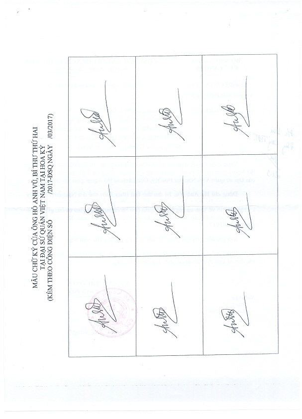 Để bảo đảm kịp thời, thống nhất và hiệu quả trong phối hợp công tác, Cục Hộ tịch, quốc tịch chứng thực thông báo 09 mẫu chữ ký của đồng chí Hồ Anh Vũ để các cơ quan, đơn vị biết.