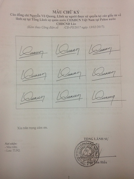 Thực hiện Quyết định số 05/2002/QĐ-BNG ngày 30/7/2002 của Bộ trưởng Bộ Ngoại giao quy định về việc tổ chức giải quyết công tác lãnh sự, căn cứ đề nghị của Tổng lãnh sự quán Việt Nam tại Pắc Xế, Bộ Ngoại giao đồng ý chấp thuận: đồng chí Nguyễn Võ Quang - Lãnh sự Tổng lãnh sự quán Việt Nam tại Pắc Xế được ủy quyền ký tất cả các giấy tờ về lãnh sự, trừ hộ chiếu ngoại giao, hộ chiếu công vụ và các giấy tờ về hộ tịch, quốc tịch mà pháp luật về hộ tịch, quốc tịch quy định phải do người đứng đầu Cơ quan đại diện ký kể từ ngày 16/02/2017 thay đồng chí Trương Tâm kết thúc nhiệm kỳ về nước.