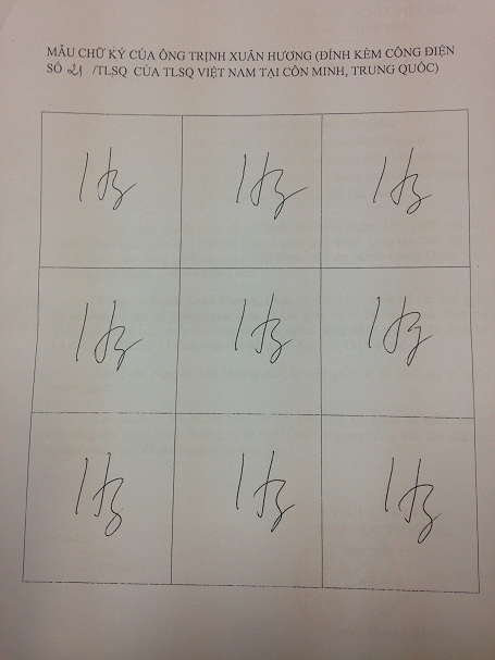 Thực hiện Quyết định số 05/2002/QĐ-BNG ngày 30/7/2002 của Bộ trưởng Bộ Ngoại giao quy định về việc tổ chức giải quyết công tác lãnh sự, căn cứ đề nghị của Tổng lãnh sự quán Việt Nam tại Côn Minh, Trung Quốc, Bộ Ngoại giao đồng ý chấp thuận: đồng chí Trịnh Xuân Hương - Lãnh sự Tổng lãnh sự quán Việt Nam tại Côn Minh, Trung Quốc được ủy quyền ký tất cả các giấy tờ về lãnh sự, trừ hộ chiếu ngoại giao, hộ chiếu công vụ và các giấy tờ về hộ tịch, quốc tịch mà pháp luật về hộ tịch, quốc tịch quy định phải do người đứng đầu Cơ quan đại diện ký kể từ ngày 20/02/2017 thay biên chế đồng chí Nguyễn Thị Hường.