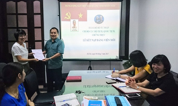 Lễ kết nạp diễn ra theo đúng trình tự, thủ tục điều lệ Đảng dưới sự chủ trì của đồng chí Nguyễn Công Khanh - Bí thư Chi bộ cùng sự tham gia của toàn thể các đồng chí đảng viên trong Chi bộ Cục Hộ tịch, quốc tịch, chứng thực. Để vinh dự được đứng trong hàng ngũ của Đảng, đồng chí Nguyễn Thị Nhung đã không ngừng phấn đấu và tu dưỡng rèn luyện, học tập theo tư tưởng, đạo đức cách mạng của Chủ tịch Hồ Chí Minh và tôn chỉ mục đích của Đảng Cộng sản Việt Nam, được chi bộ và quần chúng tín nhiệm cao.