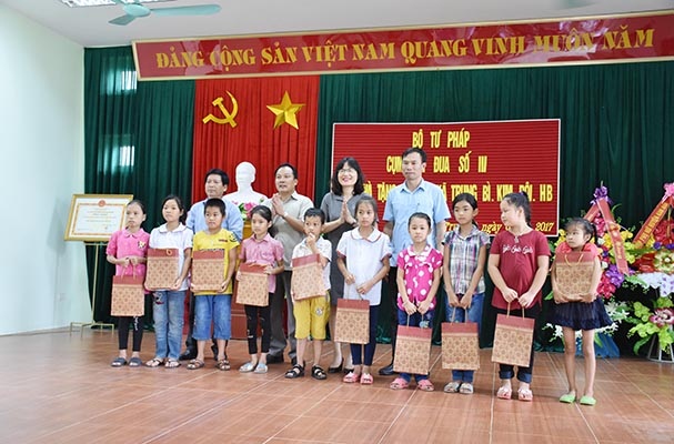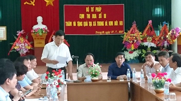 Buổi chiều, đoàn công tác của Cụm thi đua số 3 đã gặp gỡ, làm việc và trao quà tại Ủy ban nhân dân xã Trung Bì, huyện Kim Bôi, tỉnh Hòa Bình. Thể hiện sự phấn khởi, vui mừng khi nhận được sự quan tâm của Bộ Tư pháp, Cụm Thi đua số III đối với công tác Tư pháp trên địa bàn xã, đồng chí Bùi Đức Hiện, Chủ tịch Ủy ban nhân dân xã Trung Bì cho biết, dù xã còn nhiều khó khăn, thu nhập của xã chủ yếu từ sản xuất nông nghiệp, nhưng chính quyền và nhân dân xã Trung Bì đã quyết tâm huy động nguồn lực để thực hiện thành công chương trình xây dựng nông thôn mới. Đến nay, xã Trung Bì đã được công nhận là xã đạt chuẩn nông thôn mới, là xã điểm nông thôn mới của tỉnh; trong giai đoạn 2017-2020 xã đặt mục tiêu giữ vững và hoàn thiện 19 tiêu chí nông thôn mới.