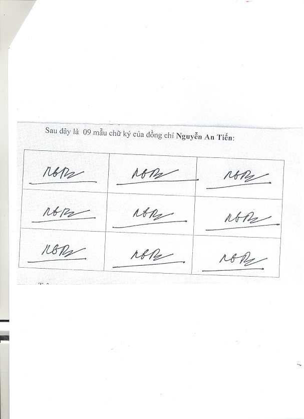 Để bảo đảm kịp thời, thống nhất và hiệu quả trong phối hợp công tác, Cục Hộ tịch, quốc tịch chứng thực thông báo 09 mẫu chữ ký của đồng chí Nguyễn An Tiến để các cơ quan, đơn vị biết.