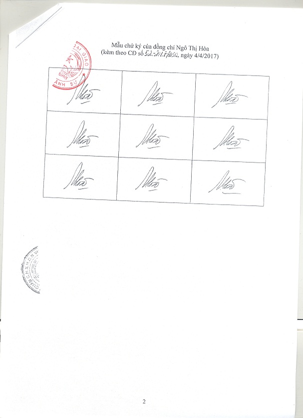 Để bảo đảm kịp thời, thống nhất và hiệu quả trong phối hợp công tác, Cục Hộ tịch, quốc tịch chứng thực thông báo 09 mẫu chữ ký của đồng chí Ngô Thị Hòa để các cơ quan, đơn vị biết.