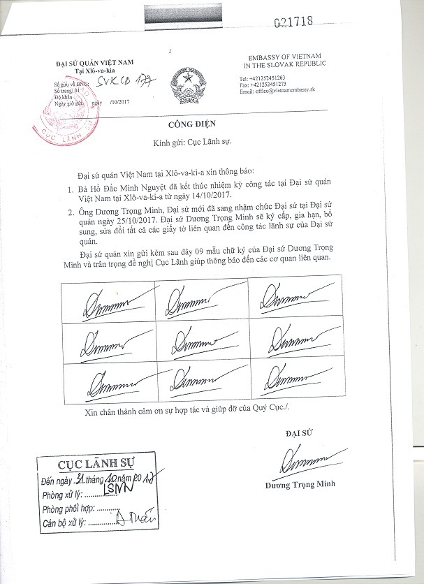 goại giao quy định về việc tổ chức giải quyết công tác lãnh sự, theo thông báo của Đại sứ Việt Nam tại Xlô-va-ki-a, Bộ Ngoại giao đồng ý chấp thuận: đồng chí Dương Trọng Minh - Đại sứ Việt Nam tại Xlô-va-ki-a được quyền ký các giấy tờ về lãnh sự kể từ ngày 25/10/2017.