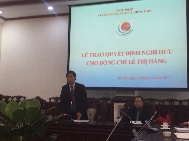 Đồng chí Nguyễn Công Khanh, Cục trưởng Cục Hộ tịch, quốc tịch, chứng thực trao Quyết định nghỉ hưu cho đồng chí Lê Thị Hằng, Chuyên viên chính, Phó Trưởng phòng Phòng Quản lý quốc tịch, Cục Hộ tịch, quốc tịch, chứng thực và điểm lại quá trình công tác của đồng chí. Trong suốt quá trình gần 30 năm, dù ở vị trí công tác nào, đồng chí cũng đều cố gắng hoàn thành xuất sắc các nhiệm vụ được giao. Với những thành tích đã đạt được trong quá trình công tác, đồng chí được tặng Kỷ niệm chương vì sự nghiệp Tư pháp và nhiều danh hiệu thi đua, khen thưởng khác. Đồng chí Nguyễn Công Khanh chúc mừng đồng chí Lê Thị Hằng đã hoàn thành xuất sắc nhiệm vụ được giao, được về nghỉ theo chế độ, đồng thời gửi lời chúc tốt đẹp đến đồng chí Lê Thị Hằng và gia đình có nhiều niềm vui, hạnh phúc và mong rằng với kinh nghiệm của mình, đồng chí sẽ tiếp tục quan tâm và đồng hành cũng sự phát triển chung của Bộ, Ngành.