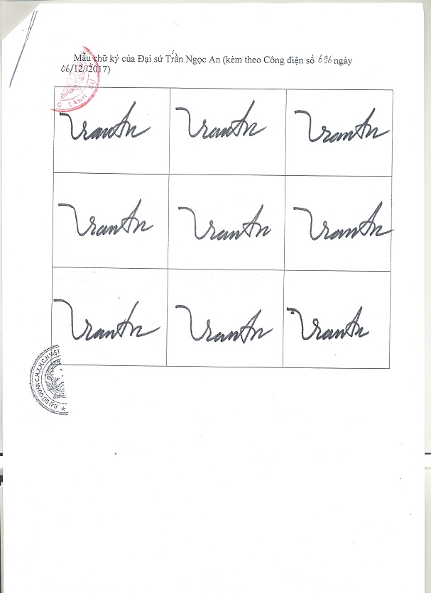 Để bảo đảm kịp thời, thống nhất và hiệu quả trong phối hợp công tác, Cục Hộ tịch, quốc tịch chứng thực thông báo 09 mẫu chữ ký của đồng chí Trần Ngọc An để các cơ quan, đơn vị biết.