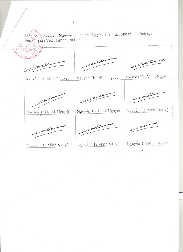 Thực hiện Quyết định số 05/2002/QĐ-BNG ngày 30/7/2002 của Bộ trưởng Bộ Ngoại giao quy định về việc tổ chức giải quyết công tác lãnh sự, căn cứ đề nghị của Đại sứ quán Việt Nam tại Ba Lan, Bộ Ngoại giao đồng ý chấp thuận: Đồng chí Nguyễn Thị Minh Nguyệt - Tham tán, Đại sứ quán Việt Nam tại Ba Lan được quyền ký tất cả các giấy tờ về lãnh sự của Đại sứ quán, trừ hộ chiếu ngoại giao thay đồng chí Phạm Trường Giang kể từ ngày 25/01/2018.