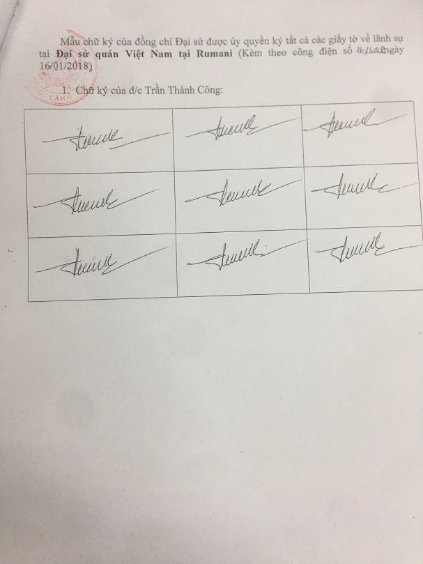 đồng chí Trần Thành Công – Đại sứ quán Việt Nam tại Ru-ma-ni được ủy quyền ký các giấy tờ về lãnh sự của Đại sứ quán, trừ hộ chiếu ngoại giao, hộ chiếu công vụ và các giấy tờ về hộ tịch, quốc tịch mà pháp luật về hộ tịch, quốc tịch quy định phải do người đứng đầu Cơ quan đại diện ký.