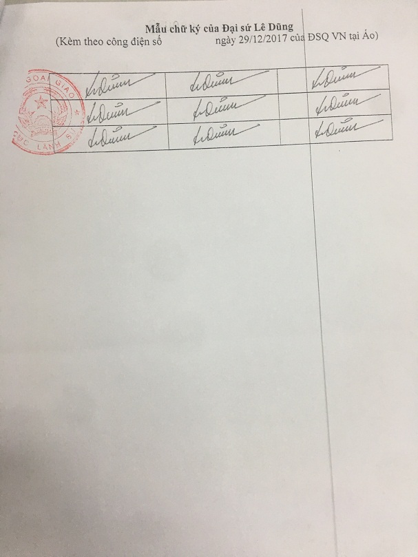 đồng chí Nguyễn Duy Khánh – Đại sứ Đặc mệnh toàn quyền nước CHXHCN Việt Nam tại Áo được ủy quyền ký các giấy tờ về lãnh sự của Đại sứ quán, trừ hộ chiếu ngoại giao, hộ chiếu công vụ và các giấy tờ về hộ tịch, quốc tịch mà pháp luật về hộ tịch, quốc tịch quy định phải do người đứng đầu Cơ quan đại diện ký, thay đồng chí Vũ Việt anh hết nhiệm kỳ về nước.