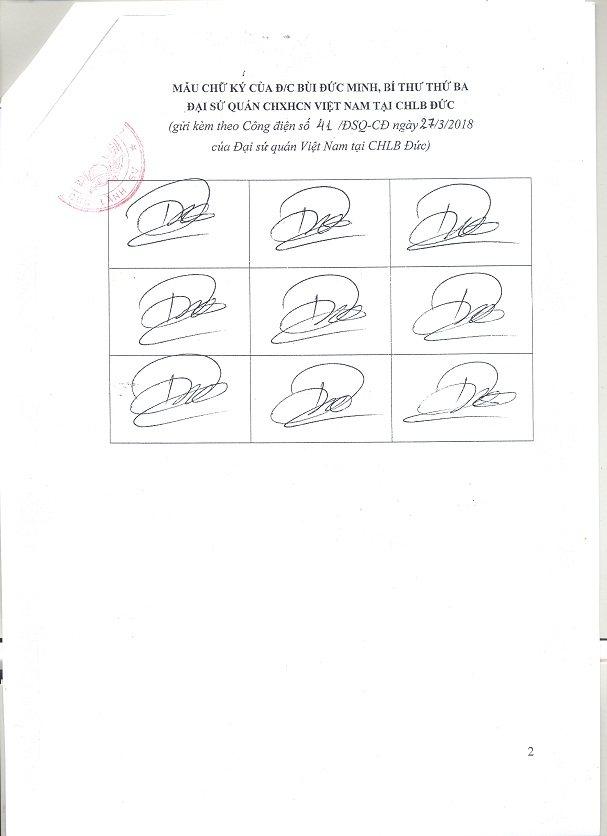 Thực hiện Quyết định số 05/2002/QĐ-BNG ngày 30/7/2002 của Bộ trưởng Bộ Ngoại giao quy định về việc tổ chức giải quyết công tác lãnh sự, theo đề nghị của Đại sứ Việt Nam tại Cộng hòa Liên bang Đức, Bộ Ngoại giao đồng ý chấp thuận: đồng chí Bùi Đức Minh - Bí thư thứ ba, Đại sứ quán nước Cộng hòa xã hội chủ nghĩa Việt Nam tại Cộng hòa Liên bang Đức, được ủy quyền ký các giấy tờ về lãnh sự của Đại sứ quán, trừ hộ chiếu ngoại giao thay đồng chí Đinh Anh Tuấn, Bí thư thứ Nhất kể từ ngày 02/4/2018.