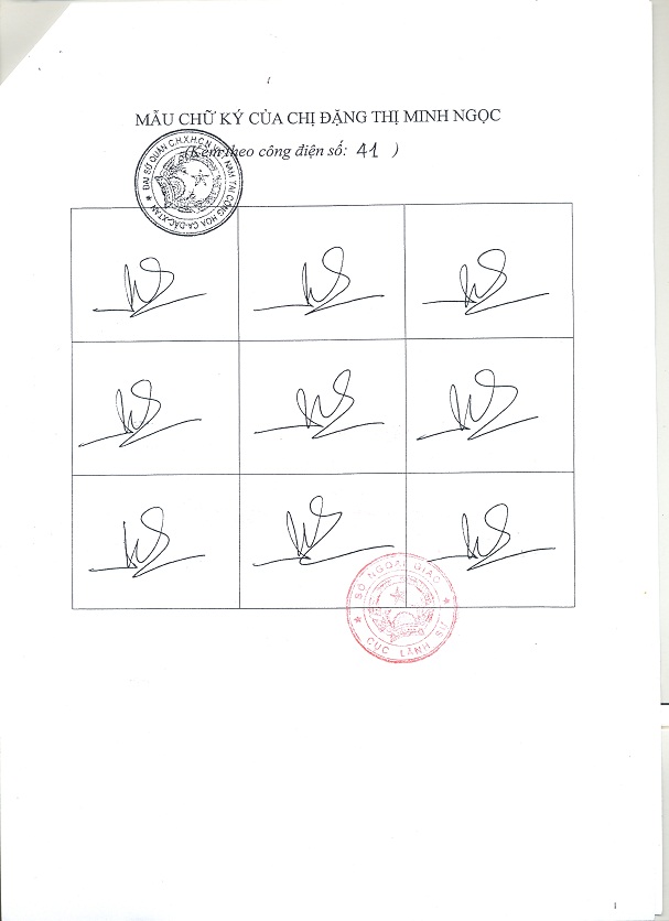 Để bảo đảm kịp thời, thống nhất và hiệu quả trong phối hợp công tác, Cục Hộ tịch, quốc tịch chứng thực thông báo 09 mẫu chữ ký đầy đủ và 09 mẫu chữ ký tắt của đồng chí Đặng Thị Minh Ngọc để các cơ quan, đơn vị biết.