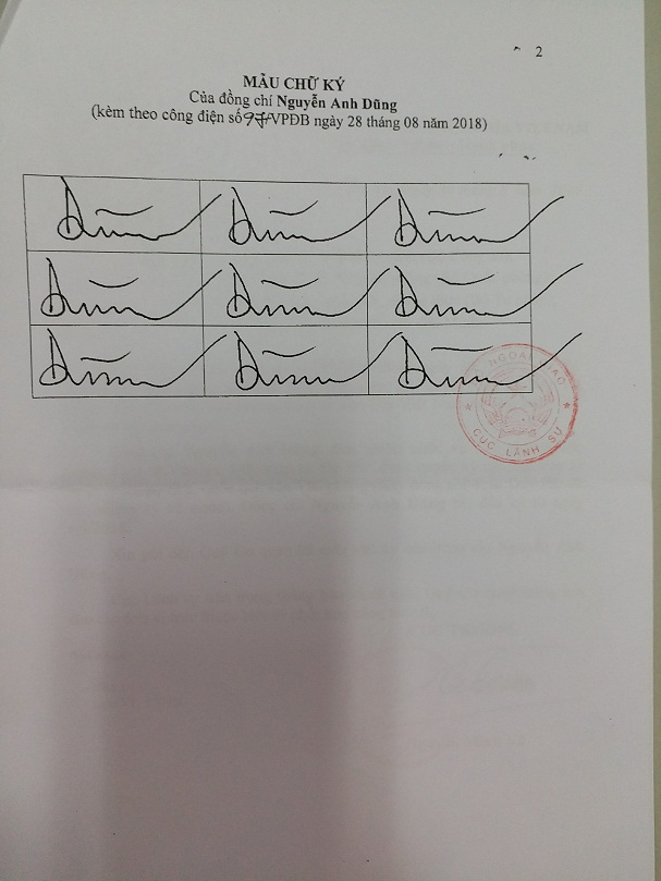 Để bảo đảm kịp thời, thống nhất và hiệu quả trong công tác phối hợp giữa các đơn vị, Cục Hộ tịch, quốc tịch chứng thực thông báo 09 mẫu chữ ký của đồng chí Nguyễn Anh Dũng tới các cơ quan, đơn vị để biết./.