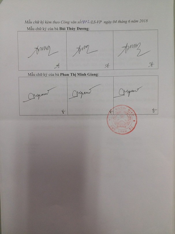 1. Bà Bùi Thùy Dương, Phó Trưởng phòng Quan hệ lãnh sự, Cục Lãnh sự ký các văn bản được ủy quyền với chức danh Phó Trưởng phòng Quan hệ lãnh sự kể từ ngày 01/6/2018;