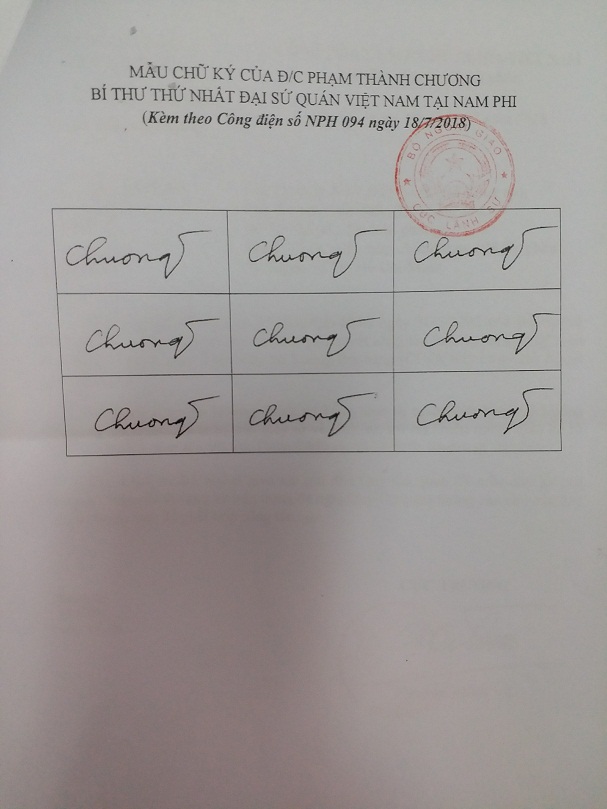 Thực hiện Quyết định số 05/2002/QĐ-BNG ngày 30/7/2002 của Bộ trưởng Bộ Ngoại giao quy định về việc tổ chức giải quyết công tác lãnh sự, căn cứ đề nghị của Đại sứ quán Việt Nam tại Nam Phi, Cục Lãnh sự - Bộ Ngoại giao đồng ý chấp thuận: đồng chí Phạm Thành Chương – Bí thư thứ Nhất, Đại sứ quán Việt Nam tại Nam Phi được ủy quyền ký tất cả các giấy tờ lãnh sự, trừ hộ chiếu ngoại giao kể từ ngày 01/8/2018 thay đồng chí Trần Trọng Thanh (đồng chí Thanh thôi ký các giấy tờ lãnh sự kể từ ngày 01/8/2018).