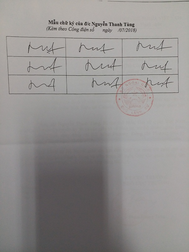 Thực hiện Quyết định số 05/2002/QĐ-BNG ngày 30/7/2002 của Bộ trưởng Bộ Ngoại giao quy định về việc tổ chức giải quyết công tác lãnh sự, căn cứ đề nghị của Đại sứ quán Việt Nam tại Canada, Cục Lãnh sự - Bộ Ngoại giao đồng ý chấp thuận: đồng chí Nguyễn Thanh Tùng – Bí thư thứ nhất, Đại sứ quán Việt Nam tại Canada được ủy quyền ký tất cả các giấy tờ lãnh sự, trừ hộ chiếu ngoại giao từ ngày 15/8/2018 thay đồng chí Bùi Minh Phương (đồng chí Phương thôi ký giấy tờ lãnh sự kể từ ngày 15/8/2018).