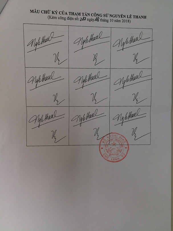 Thực hiện Quyết định số 05/2002/QĐ-BNG ngày 30/7/2002 của Bộ trưởng Bộ Ngoại giao quy định về việc tổ chức giải quyết công tác lãnh sự, căn cứ đề nghị của Đại sứ quán Việt Nam tại Ấn Độ, Cục Lãnh sự - Bộ Ngoại giao đồng ý chấp thuận: đồng chí Nguyễn Lê Thanh – Tham tán Công sứ, Đại sứ quán Việt Nam tại Ấn Độ được ủy quyền ký tất các loại giấy tờ về lãnh sự, trừ hộ chiếu ngoại giao, từ ngày 25/10/2018 thay đồng chí Hoàng Diễm Hạnh (đồng chí Hoàng Diễm Hạnh thôi ký các giấy tờ lãnh sự kể từ ngày 25/10/2018).