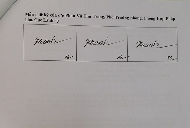 Để bảo đảm kịp thời, thống nhất và hiệu quả trong công tác phối hợp giữa các đơn vị, Cục Hộ tịch, quốc tịch chứng thực thông báo 03 mẫu chữ ký của đồng chí Phan Vũ Thu Trang với chức danh với chức danh Phó Trưởng phòng, Phòng Hợp pháp hóa lãnh sự tới các cơ quan, đơn vị để biết./.