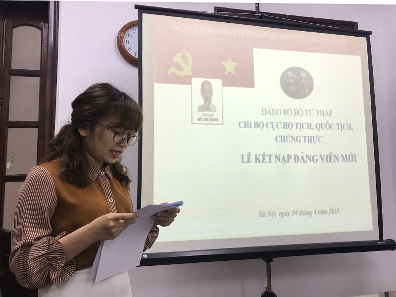 Trải qua quá trình tu dưỡng và rèn luyện của quần chúng Nguyễn Thu Thảo, được sự quan tâm, giúp đỡ của các cấp Đảng Bộ, sự ủng hộ của Đảng viên toàn Chi bộ, các đồng chí trong ban chấp hành Chi đoàn, ngày 04/04/2019, Chi bộ Cục Hộ tịch, quốc tịch, chứng thực đã tổ chức Lễ kết nạp Đảng cho quần chúng ưu tú Nguyễn Thu Thảo.