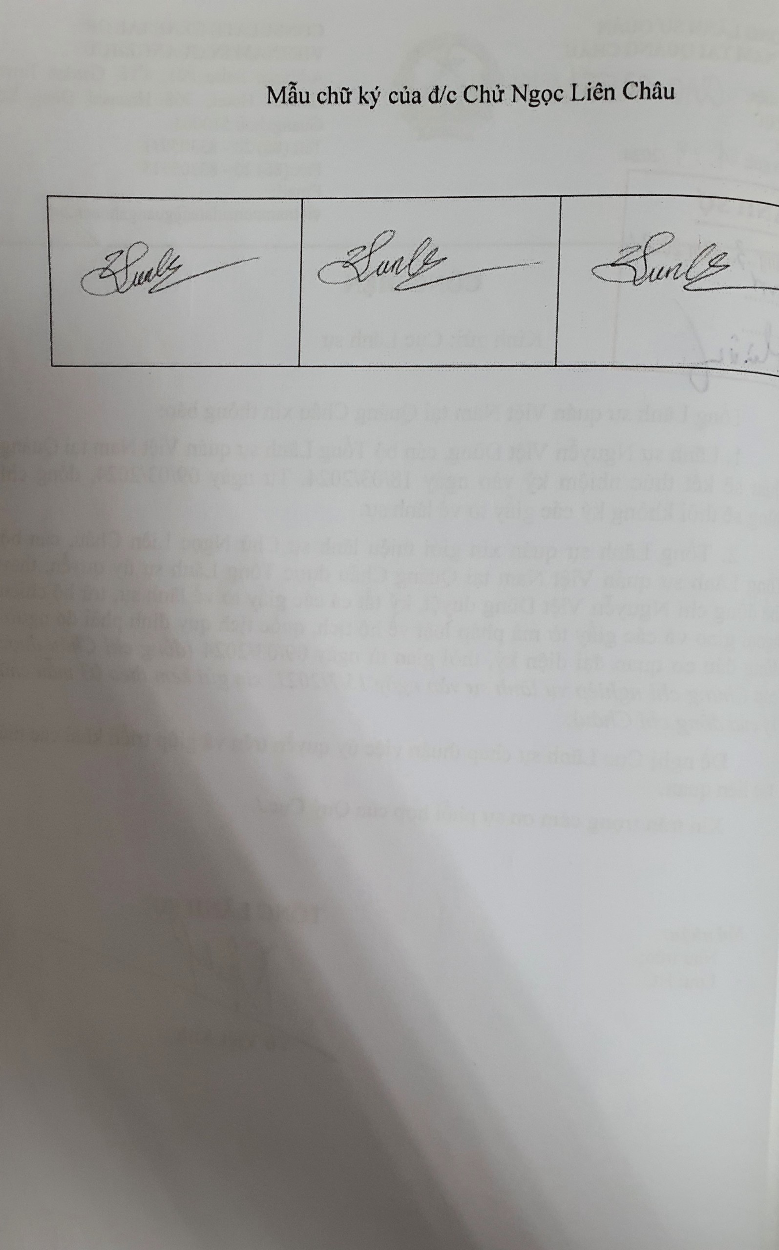 Thông báo chữ ký lãnh sự của đồng chí Chử Ngọc Liên Châu, Lãnh sự, Tổng Lãnh sự quán Việt Nam tại Quảng Châu, Trung Quốc