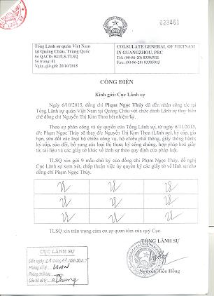 Theo đó, đồng chí Phạm Ngọc Thúy được ủy quyền ký các giấy tờ nêu trên kể từ ngày 06/11/2015 thay đồng chí Nguyễn Thị Kim Thoa (người đã được giới thiệu tại Công văn số 3182/CV-LS-LSNN ngày 10/10/2012 của Cục Lãnh sự). Đồng chí Nguyễn Thị Kim Thoa sẽ thôi ký các giấy tờ lãnh sự kể từ ngày 06/11/2015.