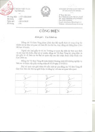 goại giao quy định về việc tổ chức giải quyết công tác lãnh sự, căn cứ đề nghị của Đại sứ quán Việt Nam tại Israel, Bộ Ngoại giao đồng ý chấp thuận: đồng chí Vũ Sơn Tùng - Bí thư thứ ba, Đại sứ quán Việt Nam tại Israel có thẩm quyền ký các giấy tờ về lãnh sự của Đại sứ quán, trừ hộ chiếu và các giấy tờ mà pháp luật về hộ tịch, quốc tịch quy định do người đứng đầu Cơ quan đại diện ký.