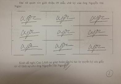 Bộ Ngoại giao đồng ý chấp thuận: đồng chí Nguyễn Hải Ngọc – Bí thư thứ nhất Đại sứ quán nước Cộng hòa xã hội chủ nghĩa Việt Nam được ký các giấy tờ về lãnh sự.