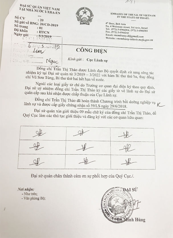Bộ Ngoại giao đồng ý chấp thuận: đồng chí Trần Thị Thảo, Bí thư thứ ba, Đại sứ quán Việt Nam tại Nhà nước I-xra-en, được ký các giấy tờ lãnh sự