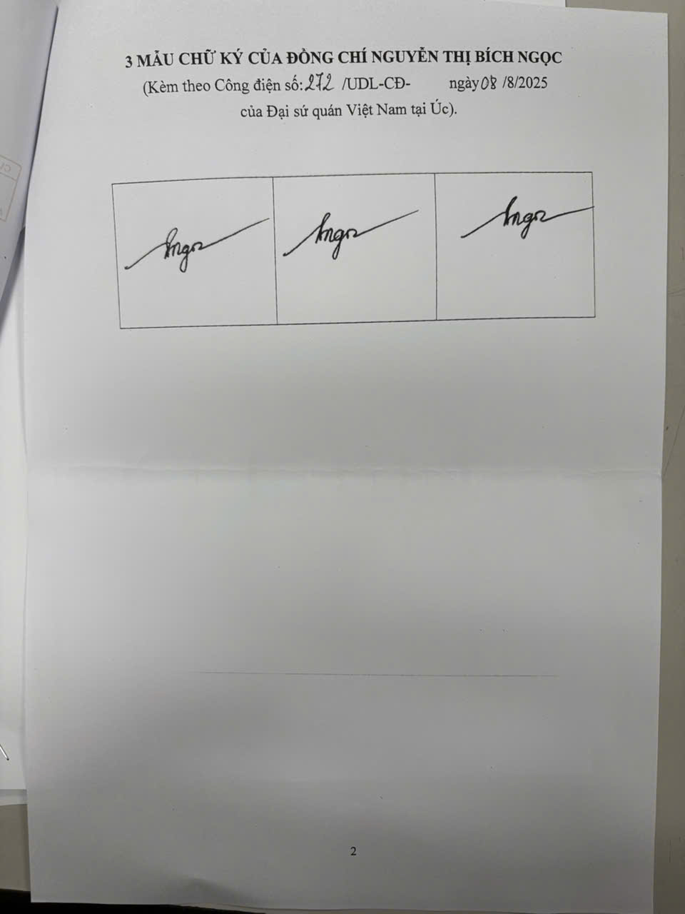Ngày 18/8/2025, Cục Hành chính tư pháp nhận được Công văn số 3884/LS-LSNN ngày 14/8/2025 của Cục Lãnh sự, Bộ Ngoại giao về việc giới thiệu chữ ký lãnh sự của đồng chí Nguyễn Thị Bích Ngọc, nội dung cụ thể như sau: