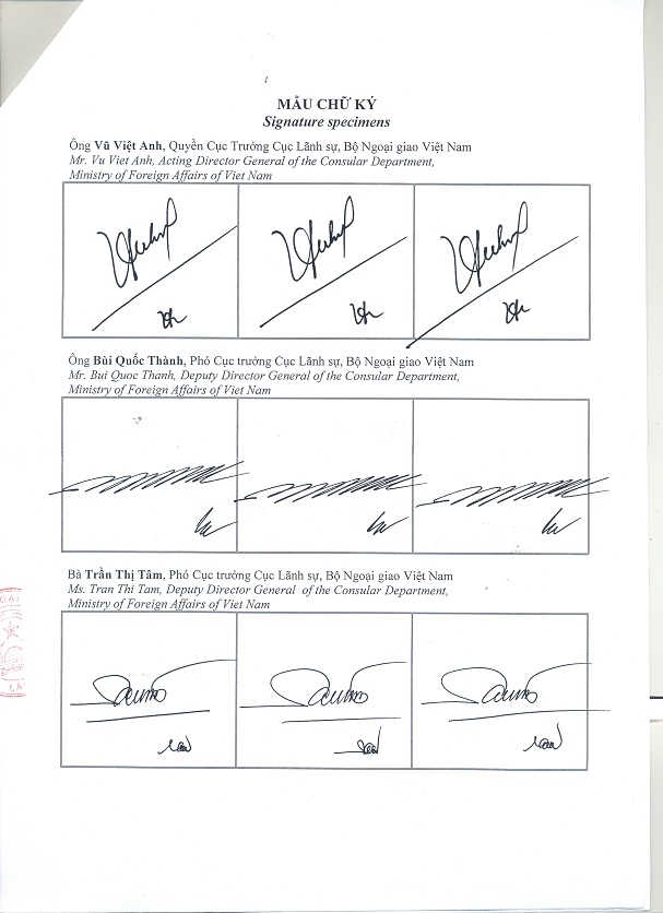 Cục Hộ tịch, quốc tịch, chứng thực nhận được Công văn số 3797/CV-LS-LSNN ngày 07/11/2018 của Cục Lãnh sự - Bộ Ngoại giao về việc giới thiệu chữ ký lãnh sự của đồng chí Vũ Thị Hương Trà, nội dung cụ thể như sau: