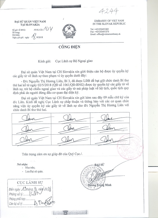 Bộ Ngoại giao đồng ý chấp thuận: Đồng chí Nguyễn Thị Hương Liên - Bí thư thứ 2, Đại sứ quán nước Cộng hòa xã hội chủ nghĩa Việt Nam tại Slovakia, được ủy quyền ký các giấy tờ về lãnh sự