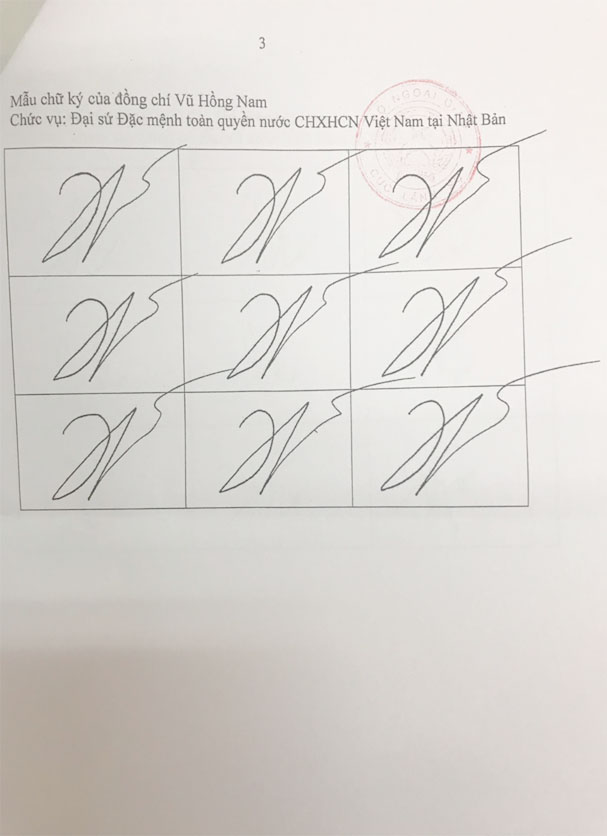 Bộ Ngoại giao đồng ý chấp thuận: đồng chí Vũ Hồng Nam – Đại sứ đặc mệnh toàn quyền nước Cộng hòa xã hội chủ nghĩa Việt Nam tại Nhật Bản có thẩm quyền ký tất cả các giấy tờ về lãnh sự