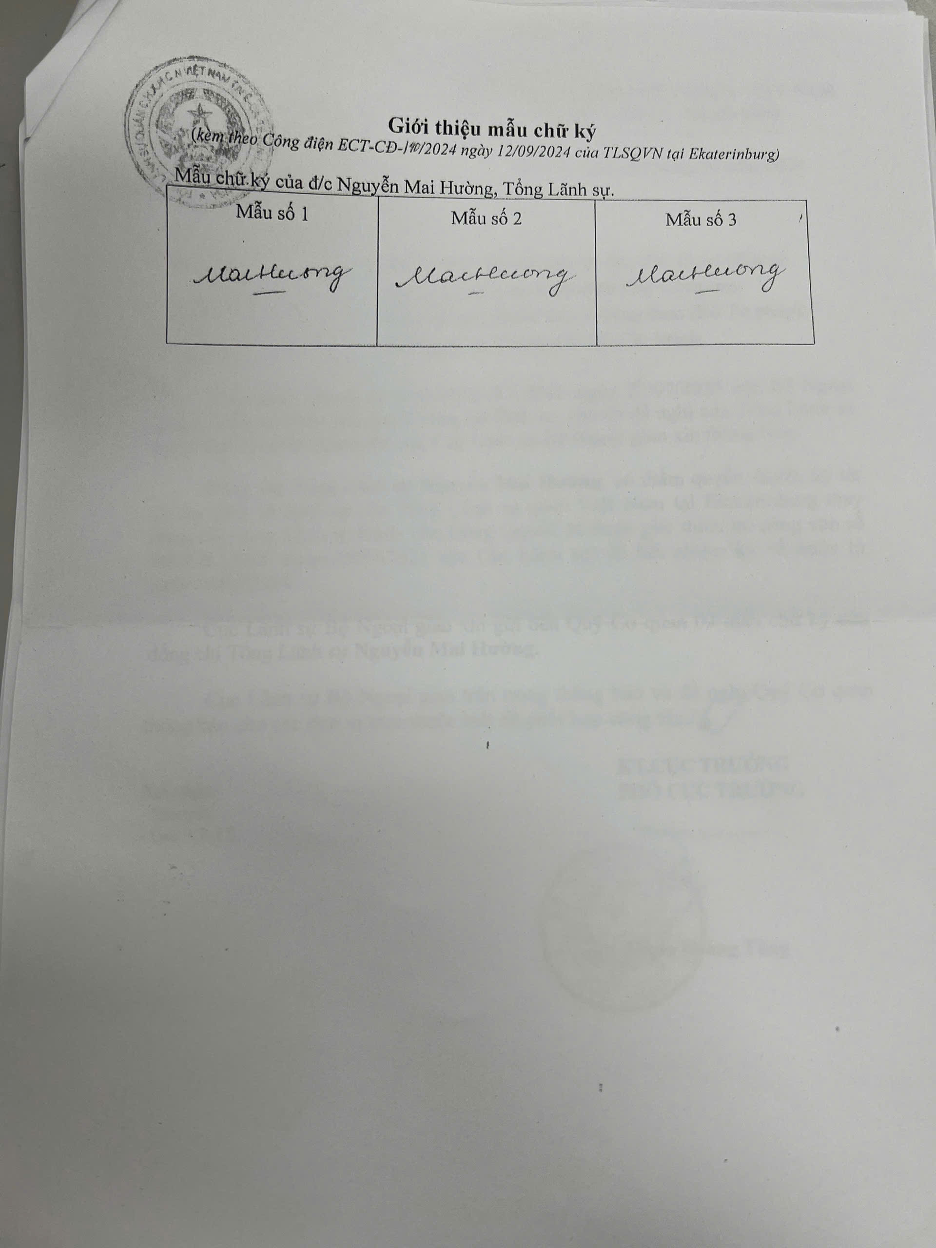 Ngày 19/9/2024, Cục Hộ tịch, quốc tịch, chứng thực nhận được Công văn số 3751/CV-LS-LSNN ngày 17/9/2024 của Cục Lãnh sự, Bộ Ngoại giao về việc giới thiệu chữ ký lãnh sự của đồng chí Nguyễn Mai Hường, nội dung cụ thể như sau: