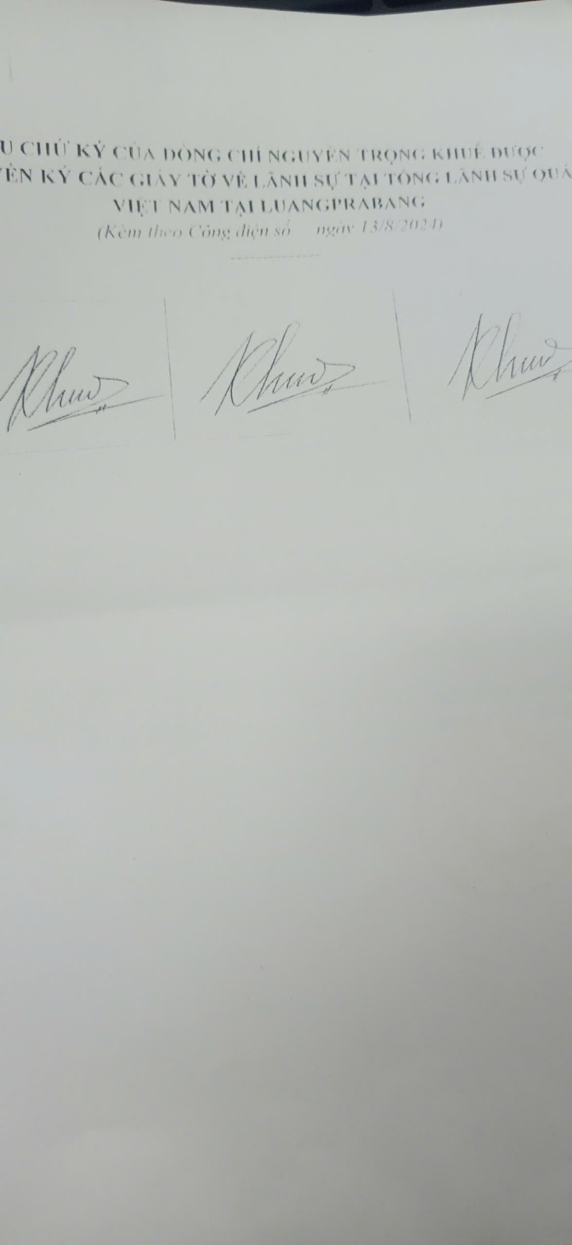 Ngày 20/8/2024, Cục Hộ tịch, quốc tịch, chứng thực nhận được Công văn số 3314/CV-LS-LSNN ngày 14/8/2024 của Cục Lãnh sự, Bộ Ngoại giao về việc giới thiệu chữ ký lãnh sự của đồng chí Nguyễn Trọng Khuê, nội dung cụ thể như sau: