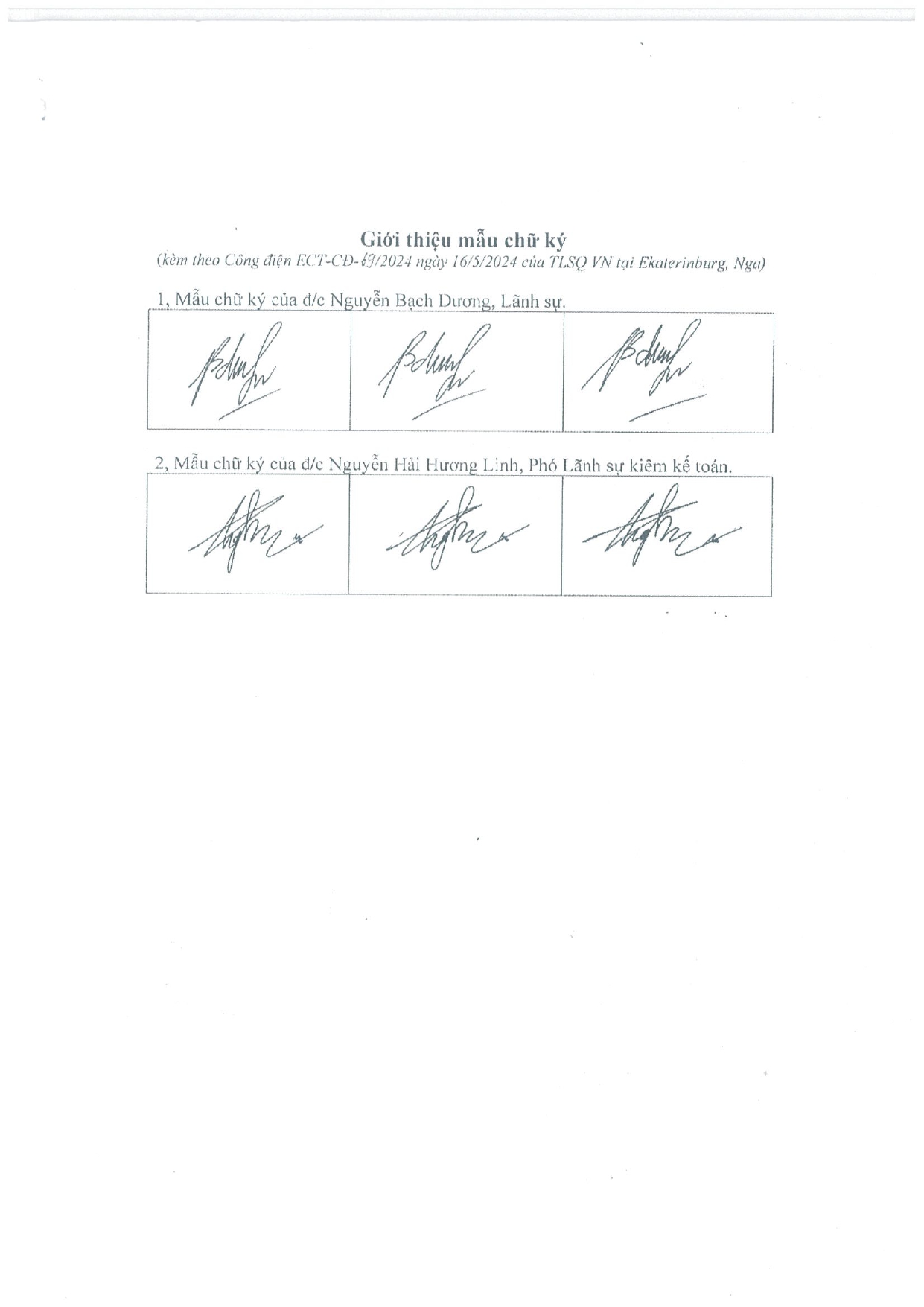 Thông báo chữ ký lãnh sự của đồng chí Nguyễn Bạch Dương, Lãnh sự và đồng chí Nguyễn Hải Hương Linh, Phó Lãnh sự Tổng Lãnh sự quán Việt Nam tại Ekaterinburg, Nga