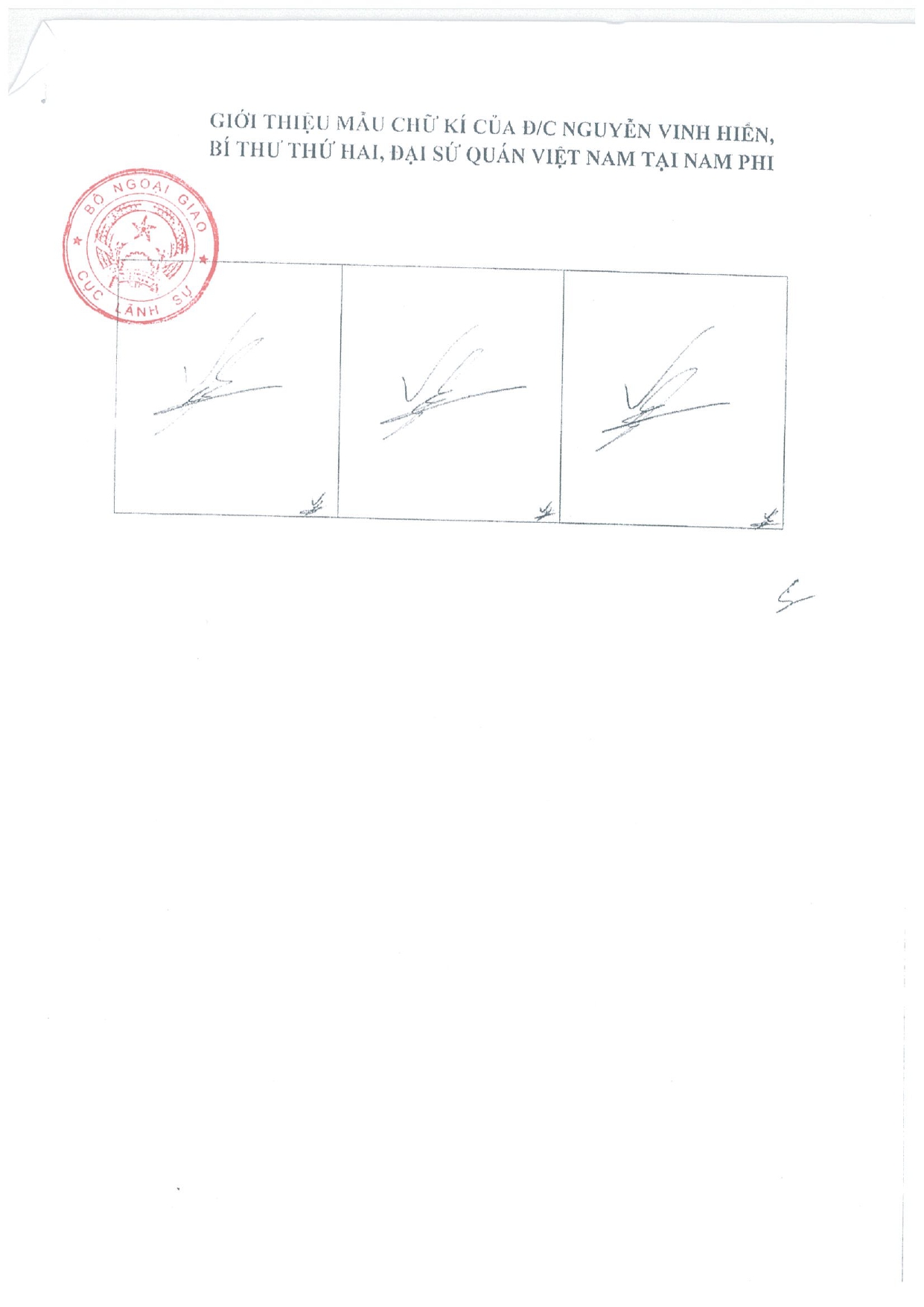 Thông báo chữ ký lãnh sự của đồng chí Nguyễn Vinh Hiển, Bí thư thứ Hai, Đại sứ quán Việt Nam tại Nam Phi