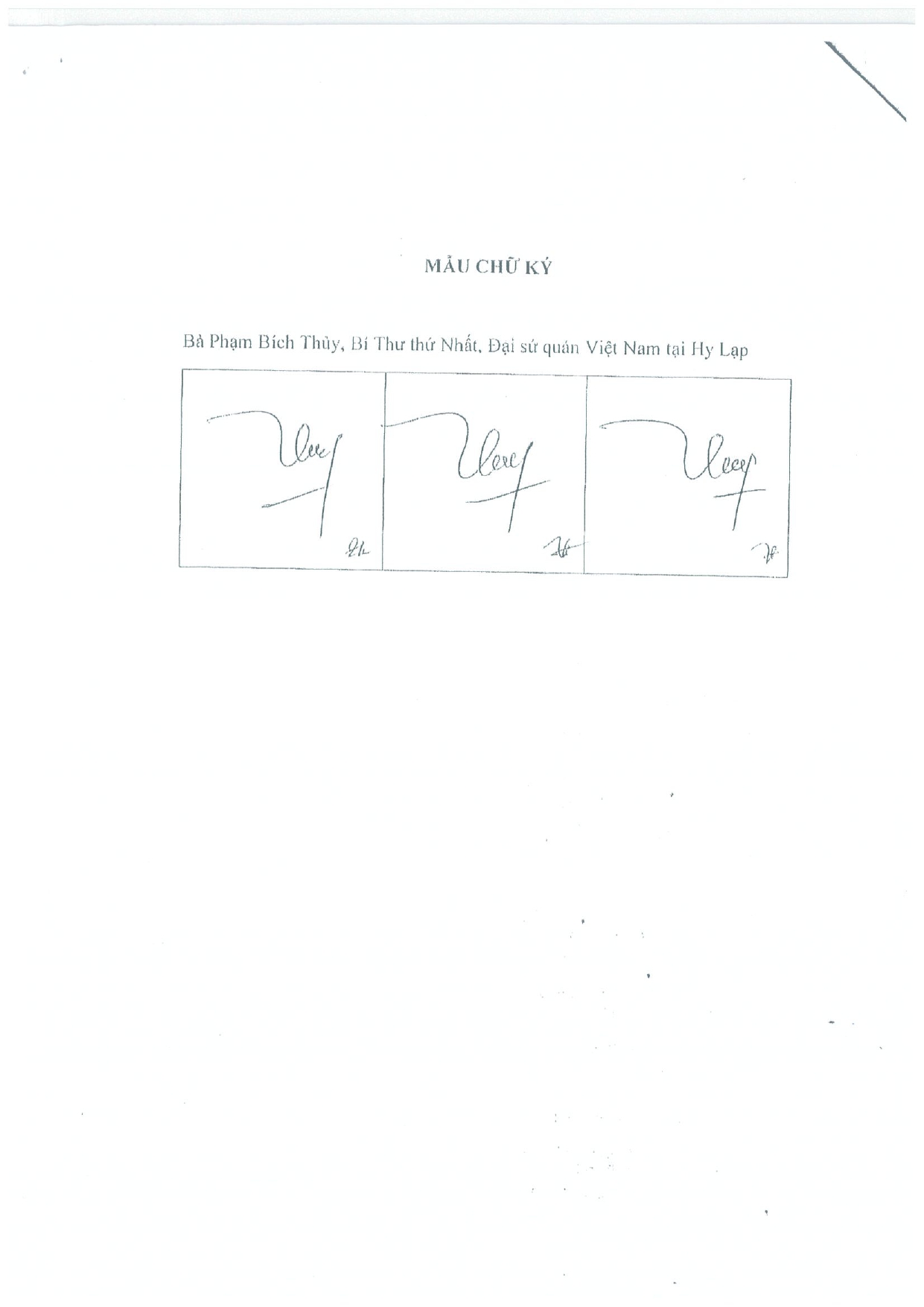 Thông báo chữ ký lãnh sự của đồng chí Phạm Bích Thuỷ, Bí thư thứ nhất, Đại sứ quán Việt Nam tại Hy Lạp