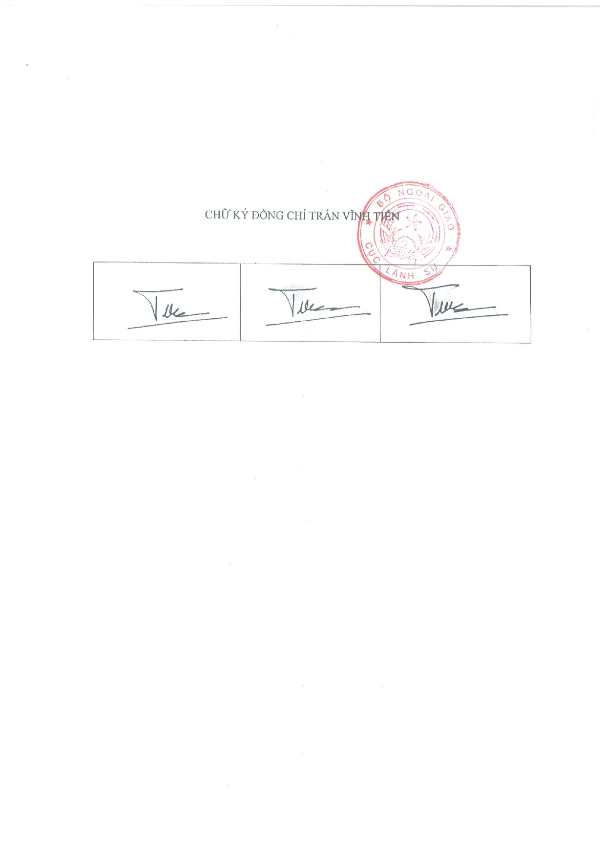 Thông báo chữ ký lãnh sự của đồng chí Trần Vĩnh Tiến, Bí thư thứ Nhất, Đại sứ quán Việt Nam tại Canada