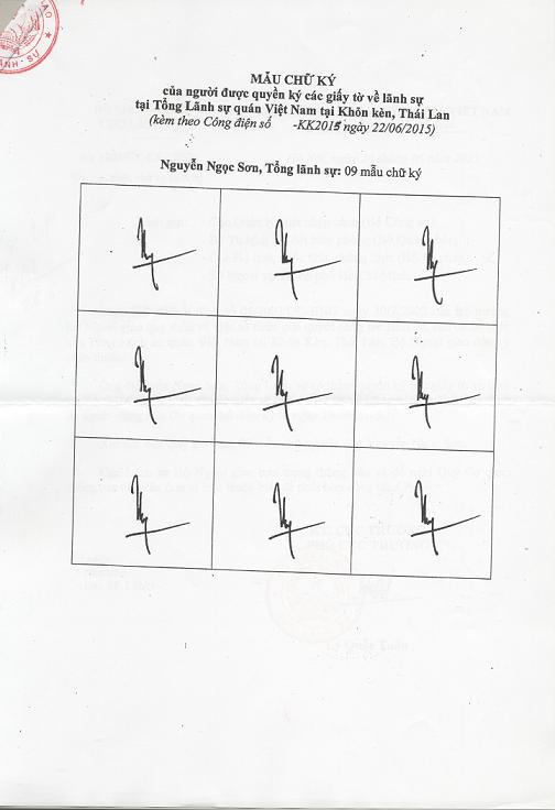 Thực hiện Quyết định số 05/2002/QĐ-BNG ngày 30/7/2002 của Bộ trưởng Bộ Ngoại giao quy định về việc tổ chức giải quyết công tác lãnh sự, căn cứ đề nghị của Tổng lãnh sự quán Việt Nam tại Khỏn Kèn, Thái Lan, Bộ Ngoại giao đồng ý chấp thuận: ông Nguyễn Ngọc Sơn - Tổng Lãnh sự, Tổng lãnh sự quán Việt Nam tại Khỏn Kèn, Thái Lan, có thẩm quyền ký các giấy tờ về lãnh sự, hộ chiếu ngoại giao và các giấy tờ mà pháp luật về hộ tịch, quốc tịch quy định do người đứng đầu Cơ quan đại diện ký. Ông Nguyễn Ngọc Sơn được ký kể từ ngày 29/6/2015. Bộ Ngoại giao thông báo 09 mẫu chữ ký của ông Nguyễn Ngọc Sơn để các cơ quan, đơn vị biết, phối hợp.