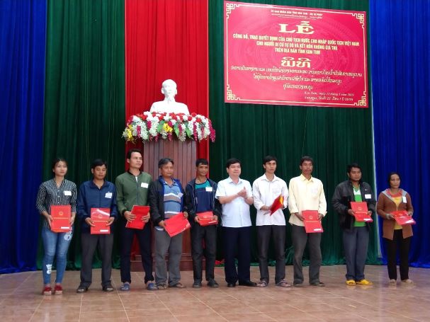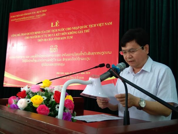 Ngày 21 và 22/5/2019 vừa qua, Ủy ban nhân dân tỉnh Kon Tum đã phối hợp với Bộ Tư pháp tổ chức Lễ công bố và trao Quyết định của Chủ tịch nước về việc cho nhập quốc tịch Việt Nam đối với 38 trường hợp người Lào di cư tự do và kết hôn không giá thú cư trú tại huyện Đăk Glei và huyện Ngọc Hồi, tỉnh Kon Tum.
