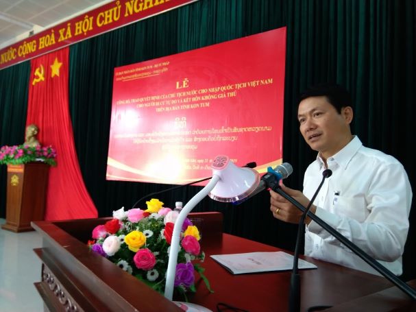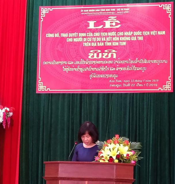 Phát biểu tại buổi lễ, đồng chí Lương Thị Lanh, Phó Cục trưởng Cục Hộ tịch, quốc tịch, chứng thực, đã đánh giá cao sự vào cuộc quyết liệt và đồng bộ của các Sở, ban, ngành của UBND tỉnh Kon Tum, từ đó giúp công tác rà soát, lập danh sách và hoàn thiện hồ sơ xin nhập quốc tịch được hoàn thiện và sớm chuyển về Bộ Tư pháp, đồng thời chúc mừng 38 người dân di cư tự do Lào tại tỉnh Kon Tum đã được chính thức trở thành công dân nước CHXHCN Việt Nam trong đợt này. Đồng chí Lương Thị Lanh cũng bày tỏ mong muốn, từ nay, các quyền và lợi ích cơ bản và hợp pháp của bà con sẽ từng bước được bảo đảm; con cháu sẽ được đăng ký khai sinh, được đảm bảo quyền được học, quyền được khám chữa bệnh và các quyền lợi khác như bao trẻ em khác.
