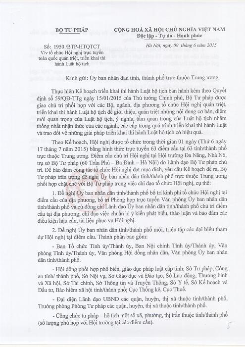 Công văn số 1950/BTP - HTQTCT Về việc tổ chức Hội nghị trực tuyến toàn quốc quán triệt, triển khai thi hành Luật hộ tịch