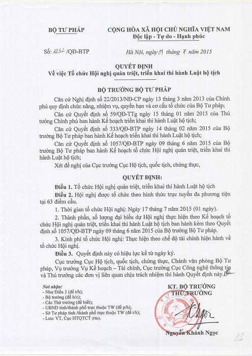 Quyết định số 1232/QĐ - BTP ngày 01 tháng 7 năm 2015 về việc Tổ chức Hội nghị quán triệt, triển khai thi hành Luật hộ tịch