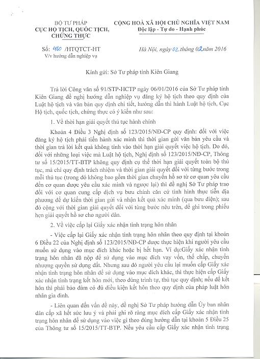 Trả lời Công văn số: 91/STP-HCTP ngày 06/01/2016 của Sở Tư pháp tỉnh Kiên Giang đề nghị hướng dẫn nghiệp vụ đăng ký hộ tịch theo quy định của Luật hộ tịch và văn bản quy định chi tiết, hướng dẫn thi hành Luật hộ tịch.